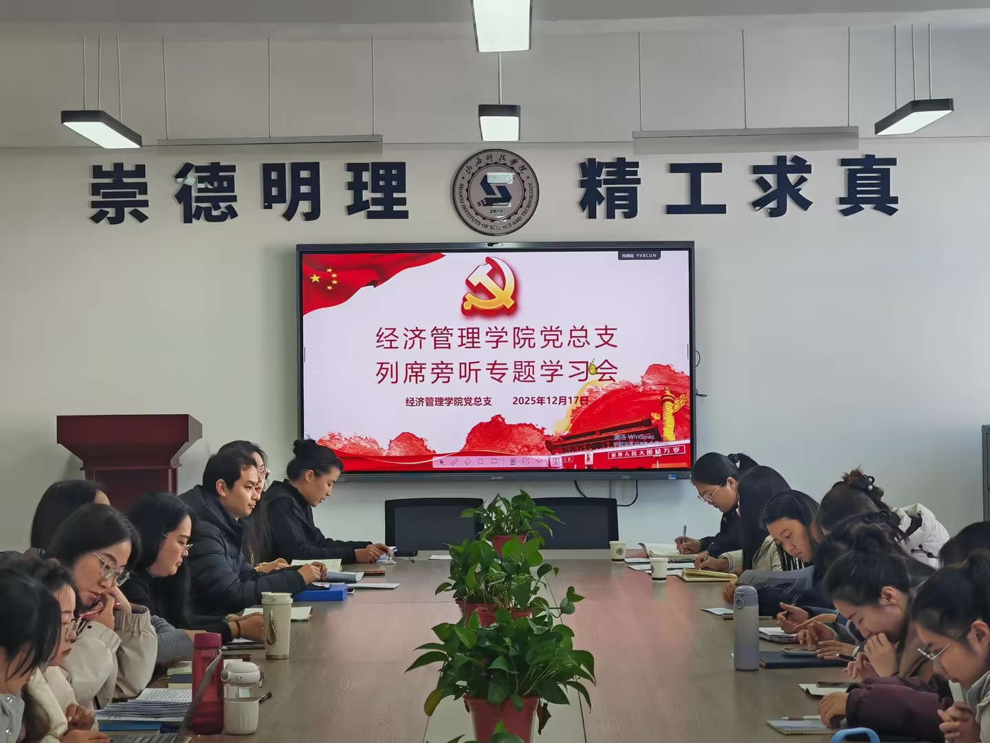 为深入学习贯彻党的二十届四中全会精神与中央经济工作会议部署,切实以党建引领学院高质量发展,2025年12月17日经济管理学院党总支组织召开列席旁听理论学习专题会议。经济管理学院全体教师党员以及学生党员代表参会,文旅康养学院党总支书记赵芳同志列席旁听。会议严格遵循既定议程,通过集中领学、深度研讨、部署落实等环节,推动理论学习走深走实、落地见效。